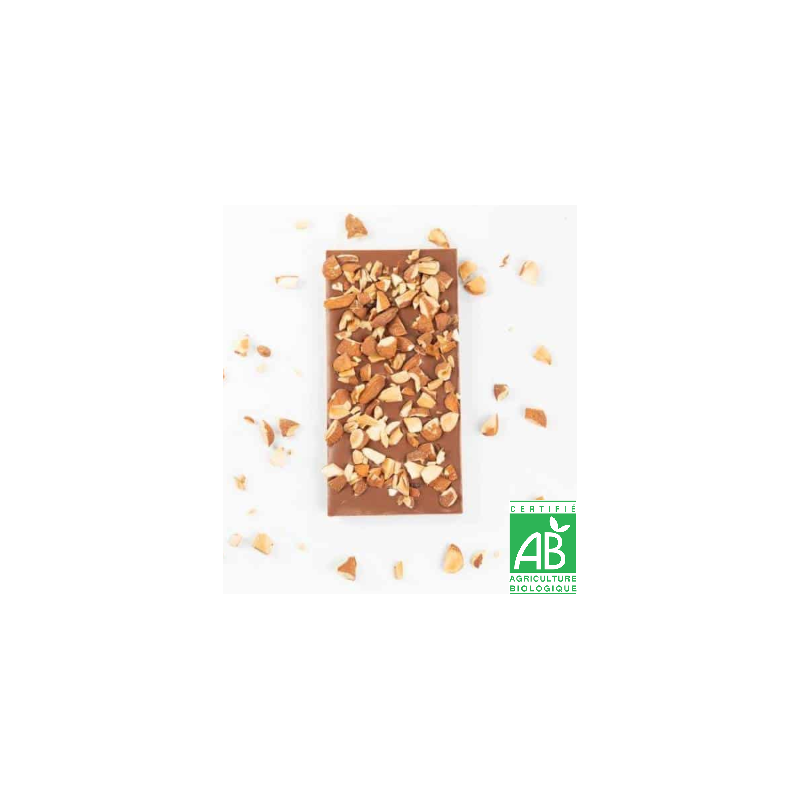 Tablette de chocolat au lait bio agrémentée de graines de lin (produites à Sacquenay) et d'amendes concassées.